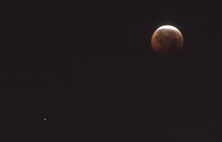 Saturn (links unten) und Mond zehn Minuten nach Ende der Totalität zu Beginn der astronomischen Morgendämmerung