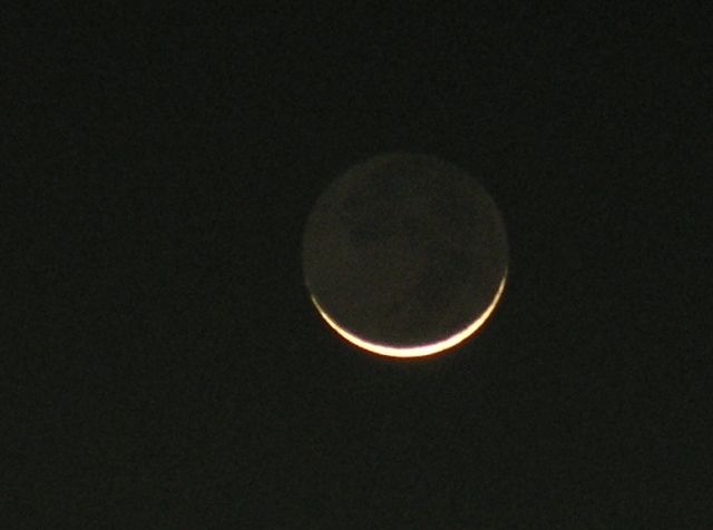 am Abend danach ist der Mond wieder direkt zu sehen - mit für Mitteleuropäer ungewohnter waggerechter Lage der Sichel(Mondalter 30 Stunden, Beleuchtungsgrad 2.4%)